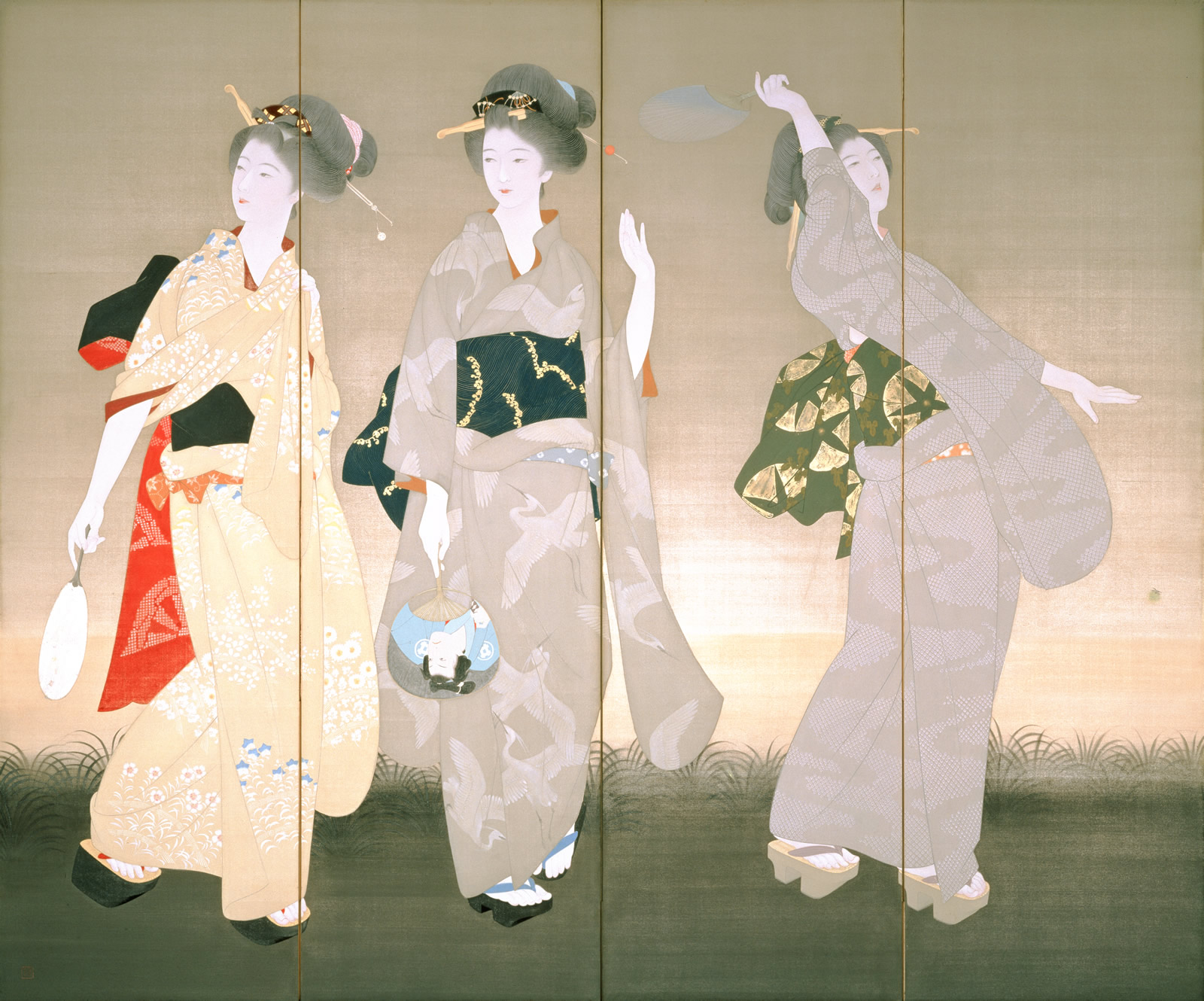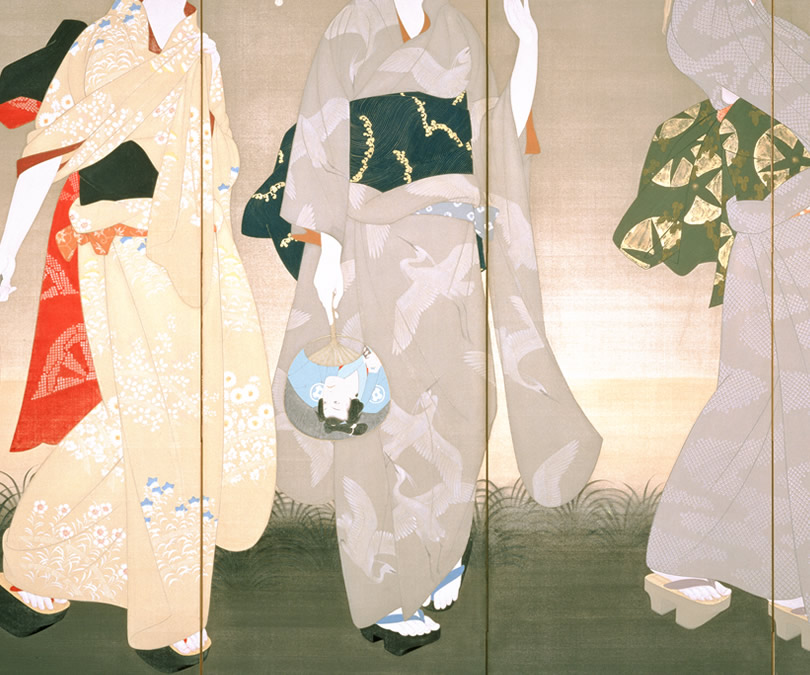 夕闇迫る野辺で、団扇を片手に蛍を追う三人の女性たちが清楚に描かれています。描かれた女性たちの顔立ちは皆似ており、すべて秀峰の夫人がモデルだったと言われています。